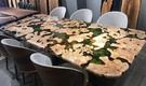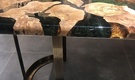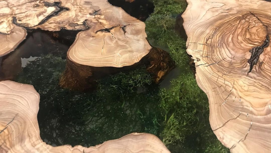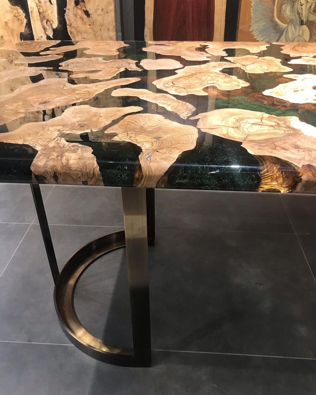 Introduce an exquisite addition to any space with the AIDA DINING TABLE. This stunning piece features a unique tabletop made of olive wood, natural moss, and crystal clear resin, creating a one-of-a-kind design that is both modern and rustic. The half-moon metal legs are gold plated, adding a touch of elegance to the table's overall look. If you're looking for a custom design, we can create tables with various designs to suit your style. The AIDA DINING TABLE is an exceptional choice for a luxurious and sophisticated dining experience.