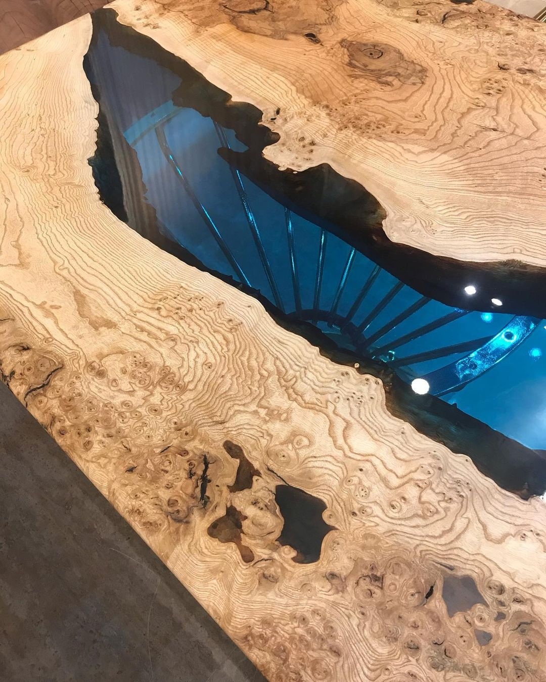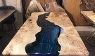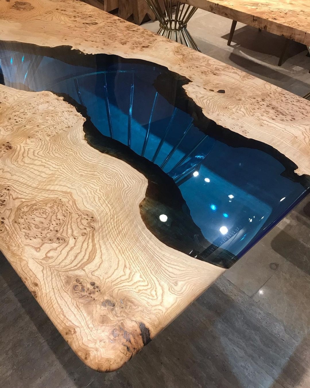 The LARS RIVER DINING TABLE is a stunning piece of furniture that will elevate any space. The tabletop is a beautiful combination of transparent blue resin epoxy and wood, creating a unique and eye-catching design. The river design resin epoxy creates a mesmerizing effect that is sure to impress your guests. The table is supported by gold plated stainless steel legs, adding a touch of elegance to the overall design. The eased edges provide a comfortable and sleek finish to the table.