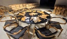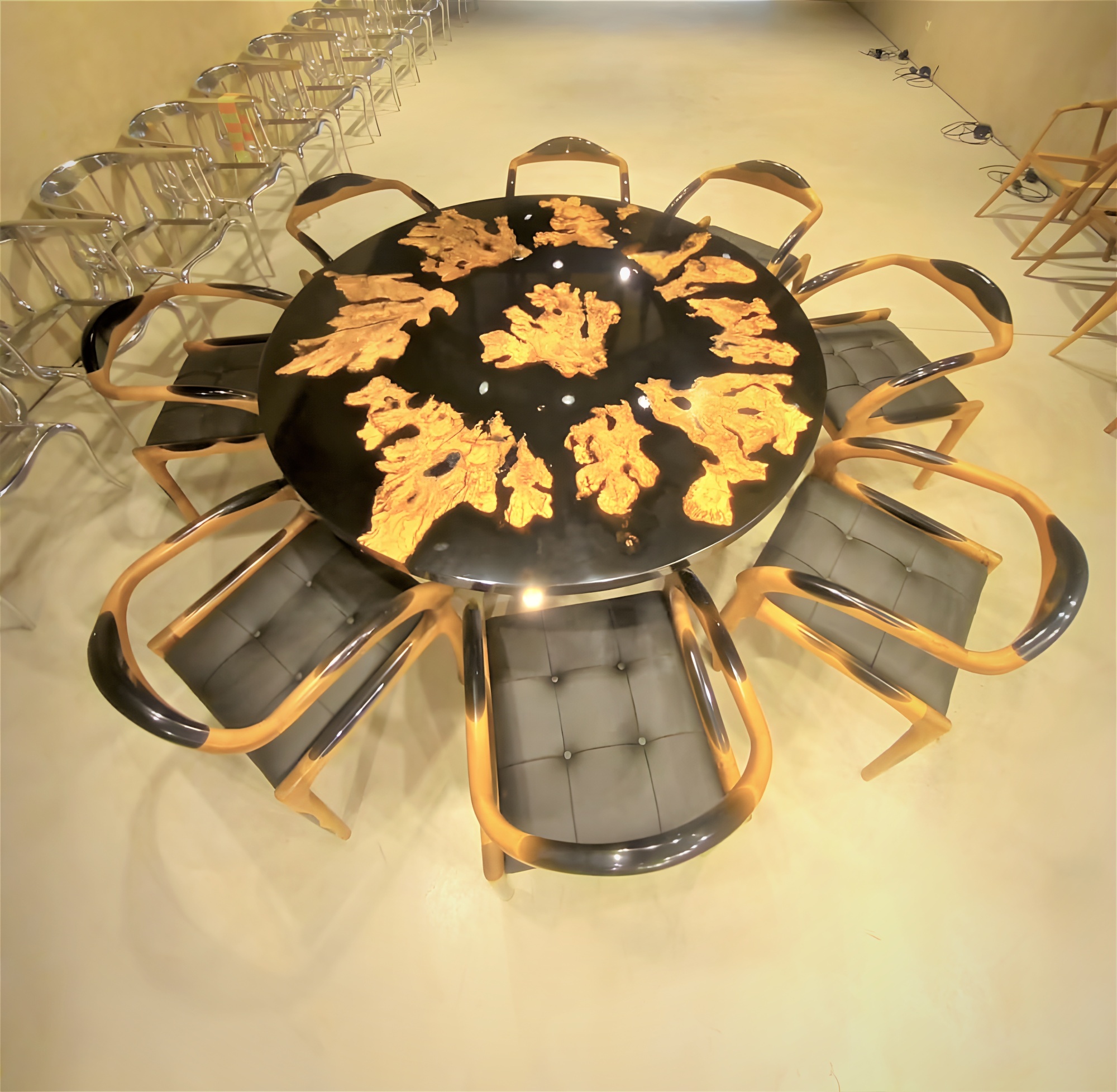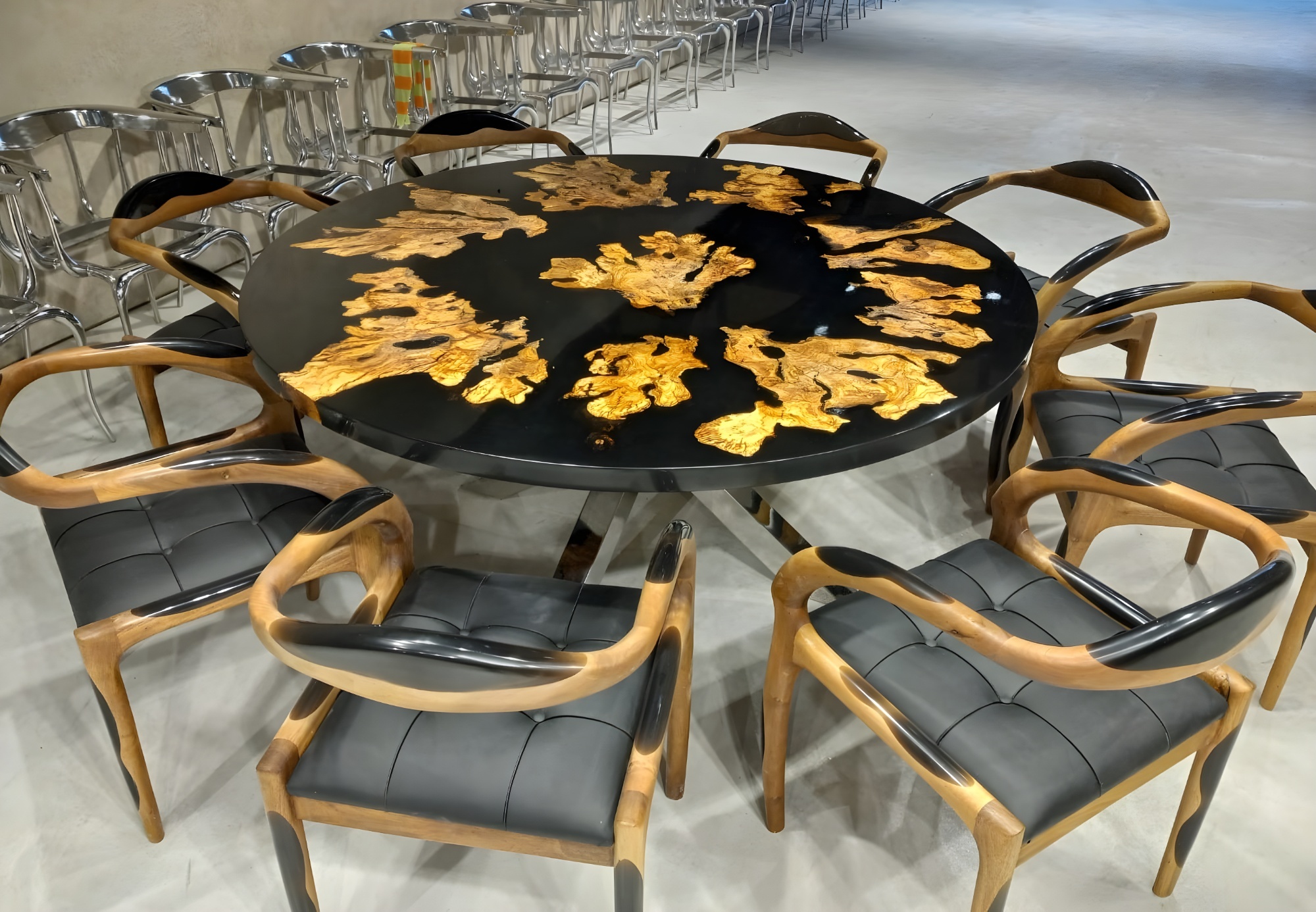 Introducing the MIDGE ROUND DINING TABLE, an artisan-made piece. Crafted from the finest olive wood, each part is carefully selected to perfectly match each other. The semi-transparent black resin adds depth to the look of the table, making it a stunning centerpiece in any room. Pair it with our matching dining chairs, made of solid wood, and stainless steel legs for a cohesive look. Rest assured that all wood used in our furniture goes through a serious drying period for years before processing, ensuring the highest quality. Meet your new favorite table, the MIDGE ROUND DINING TABLE.