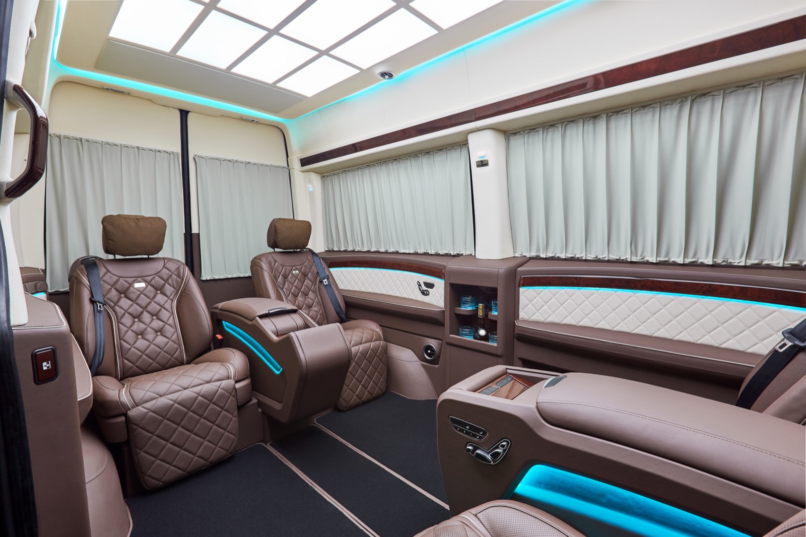 On request, the premium KLASSEN® salon can be equipped with technological, comfortable Maybach seats or S-Class seats. Its functions include multi-zone seat and backrest adjustment, heating, ventilation and massage. The armchairs are covered with high-quality leather and additionally sewn with geometric ornaments in the Maybach style. The chairs are also equipped with adjustable footrests and headrests. There are also folding transformer tables in the center console.
