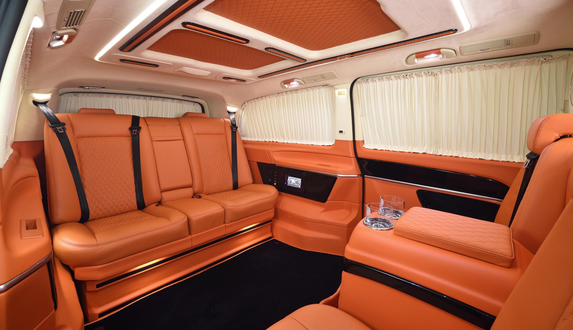 An Alpine multimedia system with Apple Car Play, Apple TV and various outputs for mobile devices will satisfy even the most demanding tastes. The elegant LED ceiling construction provides soft and even light in the VIP lounge. The system control is located in the center console. The options are managed and visualized on the screen.