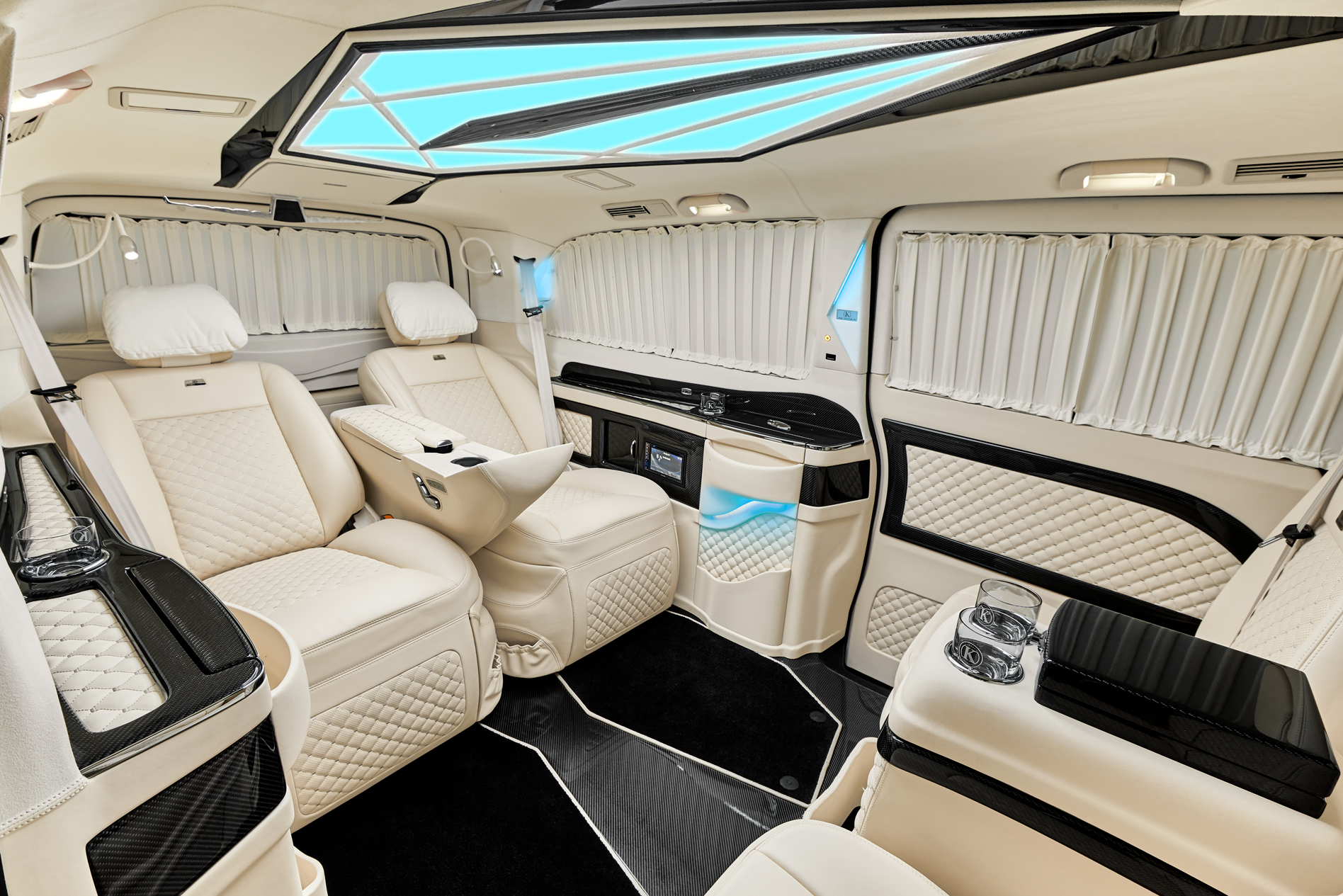 An Alpine multimedia system with Apple Car Play, Apple TV and various outputs for mobile devices will satisfy even the most demanding tastes. The elegant LED ceiling construction provides soft and even light in the VIP lounge. The system control is located in the center console. The options are managed and visualized on the screen.