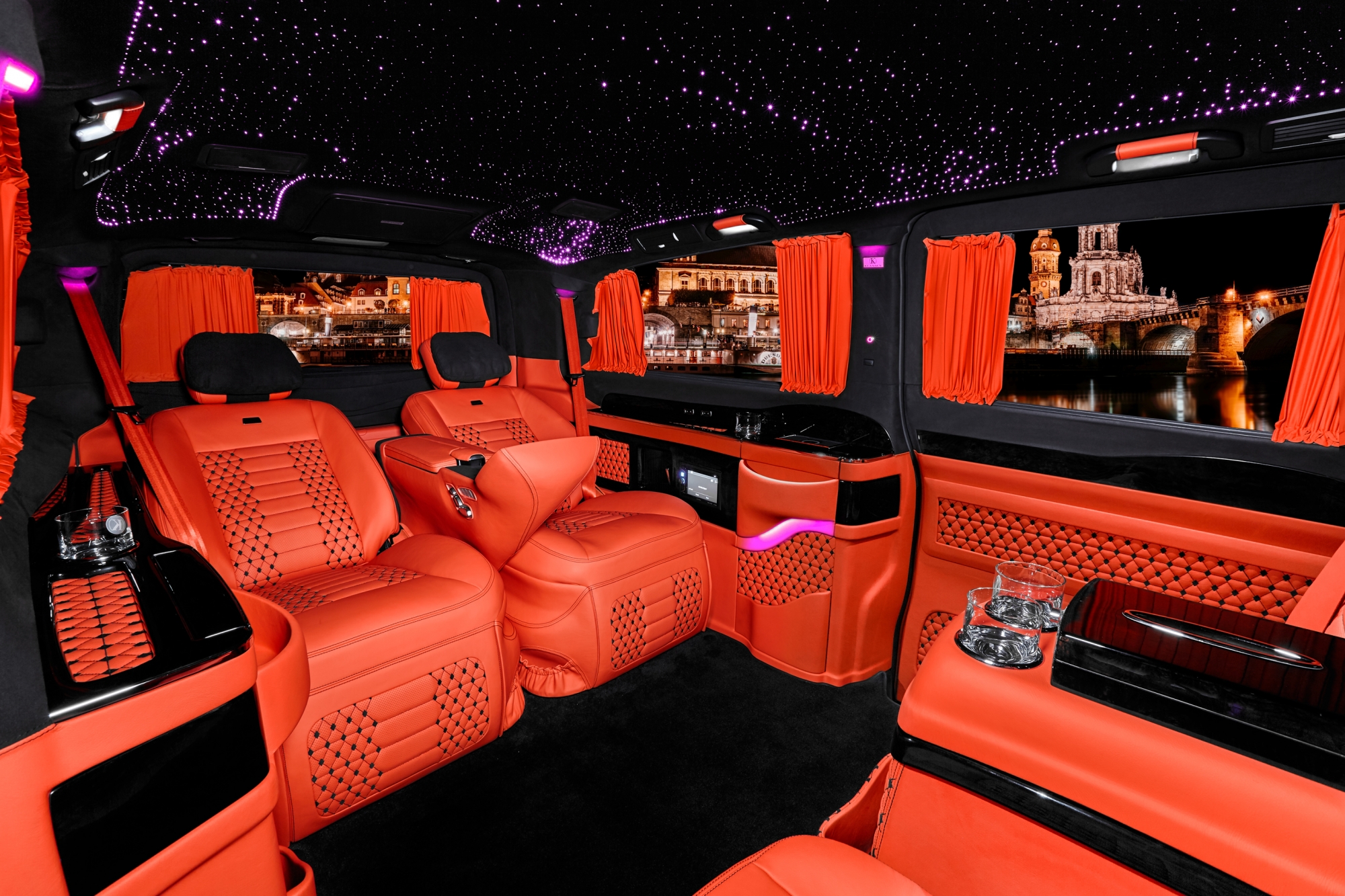 An Alpine multimedia system with Apple Car Play, Apple TV and various outputs for mobile devices will satisfy even the most demanding tastes. The elegant LED ceiling construction provides soft and even light in the VIP lounge. The system control is located in the center console. The options are managed and visualized on the screen.