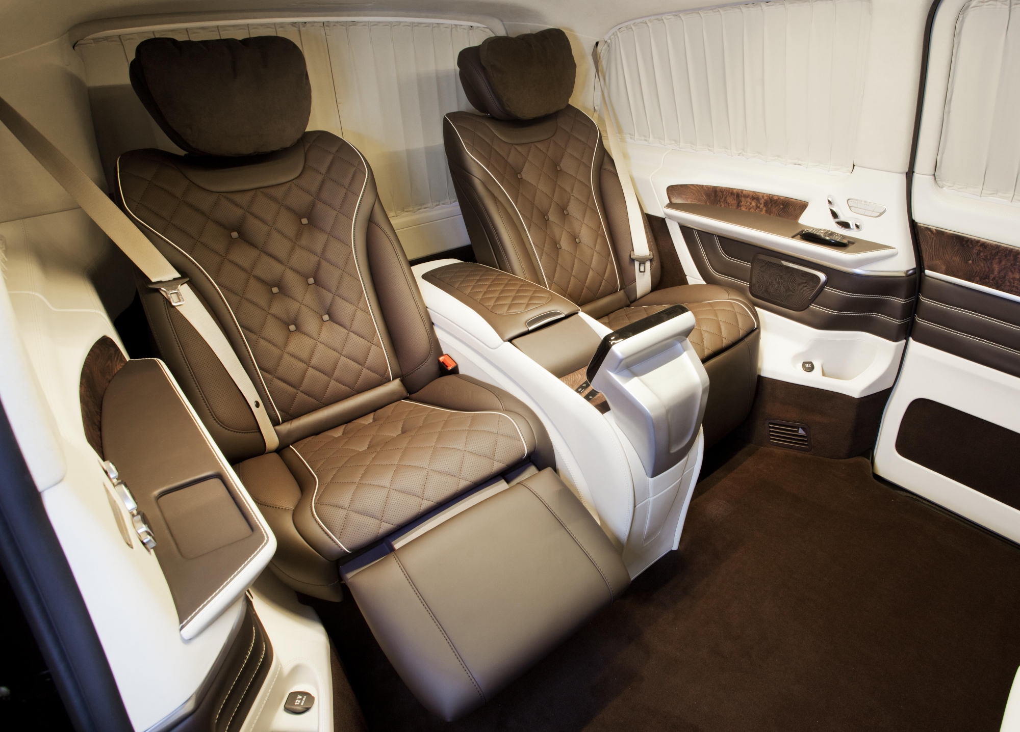 The VIP lounge of the premium class is equipped with technological, comfortable Maybach seats or S-class seats. Its functions include multi-zone seat and backrest adjustment, heating, ventilation and massage. The seats are covered with high-quality leather and additionally sewn with geometric ornaments in Maybach style. The seats are also equipped with adjustable footrests.