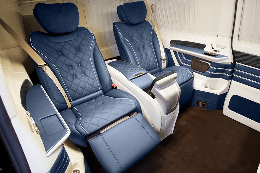 The VIP lounge of the premium class is equipped with technological, comfortable Maybach seats or S-class seats. Its functions include multi-zone seat and backrest adjustment, heating, ventilation and massage. The seats are covered with high-quality leather and additionally sewn with geometric ornaments in Maybach style. The seats are also equipped with adjustable footrests.