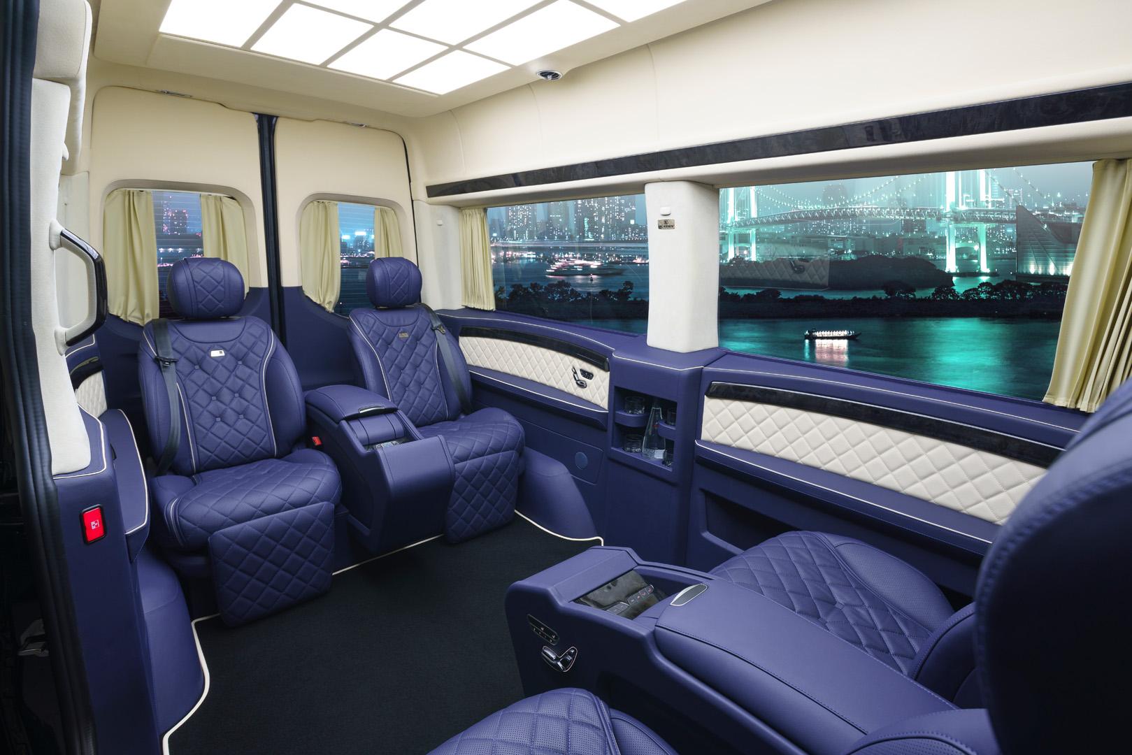 On request, the premium KLASSEN® salon can be equipped with technological, comfortable Maybach seats or S-Class seats. Its functions include multi-zone seat and backrest adjustment, heating, ventilation and massage. The armchairs are covered with high-quality leather and additionally sewn with geometric ornaments in the Maybach style. The chairs are also equipped with adjustable footrests and headrests. There are also folding transformer tables in the center console.